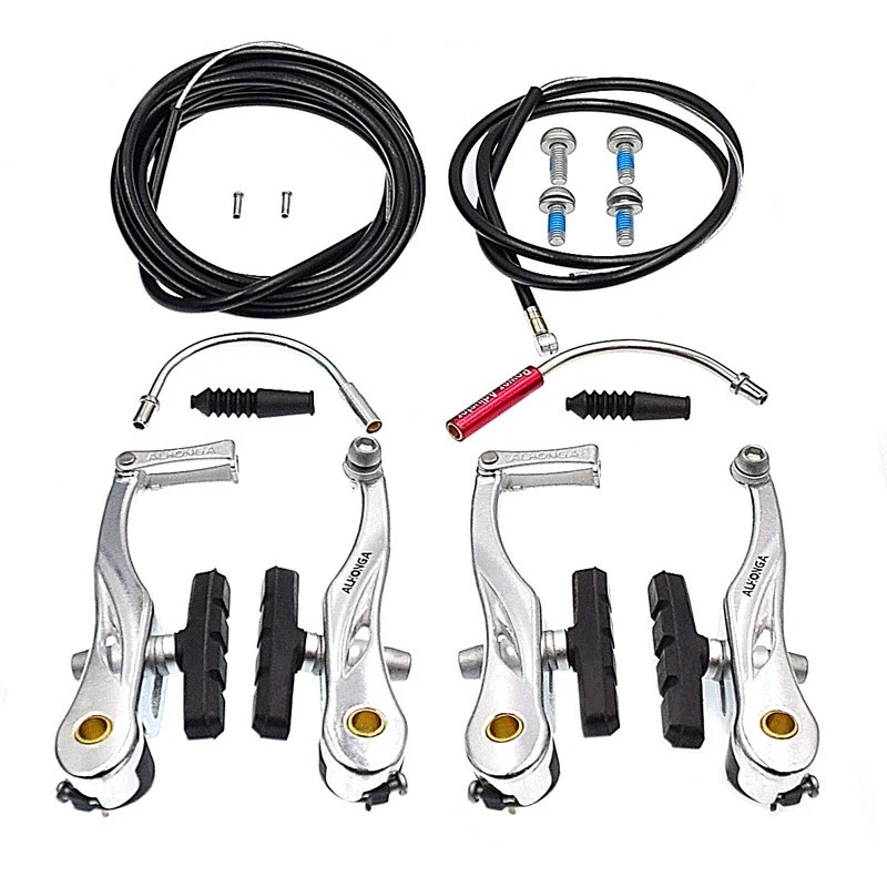 Paire de frein V-Brake avant et arrière pour vélo. L’ensemble complet comprend : Visserie, Gaine Teflon, 2 coudes, 2 embouts de câbles de frein, 2 câbles inox avec gaine et 2 étriers de freinage V-Brake en aluminium avec patins large en caoutchouc.